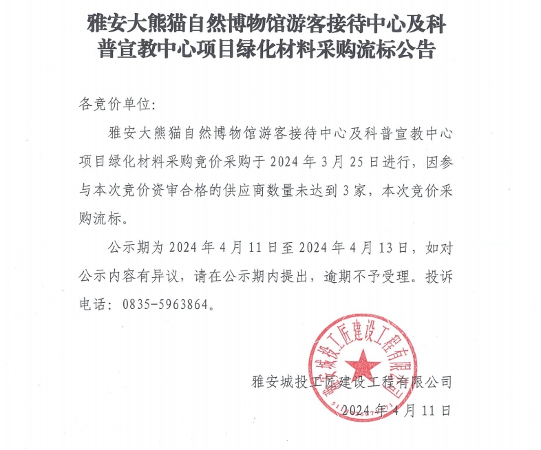 雅安大熊貓自然博物館游客接待中心及科普宣教中心項目綠化材料采購流標(biāo)公告