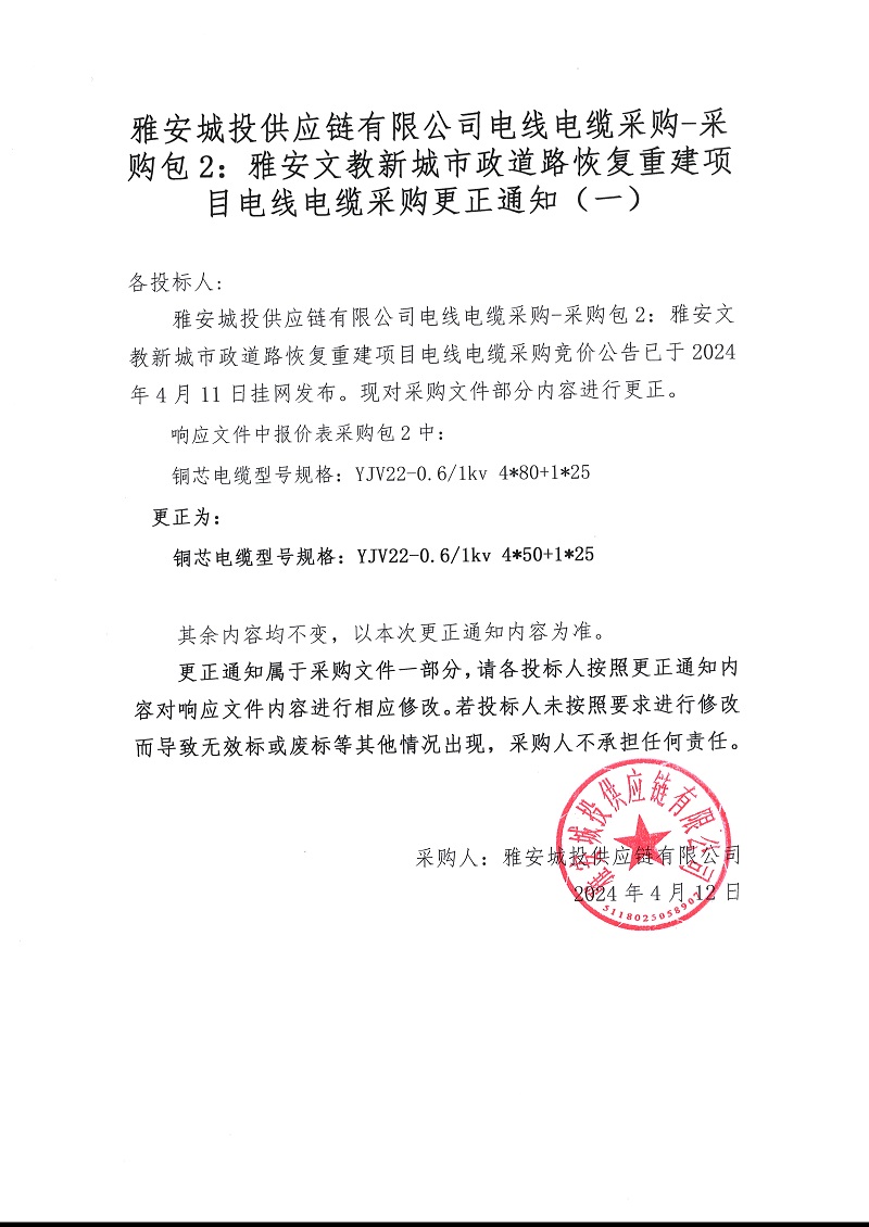 雅安城投供應鏈有限公司電線電纜采購-采購包2:雅安文教新城市政道路恢復重建項目電線電纜采購更正通知(一)