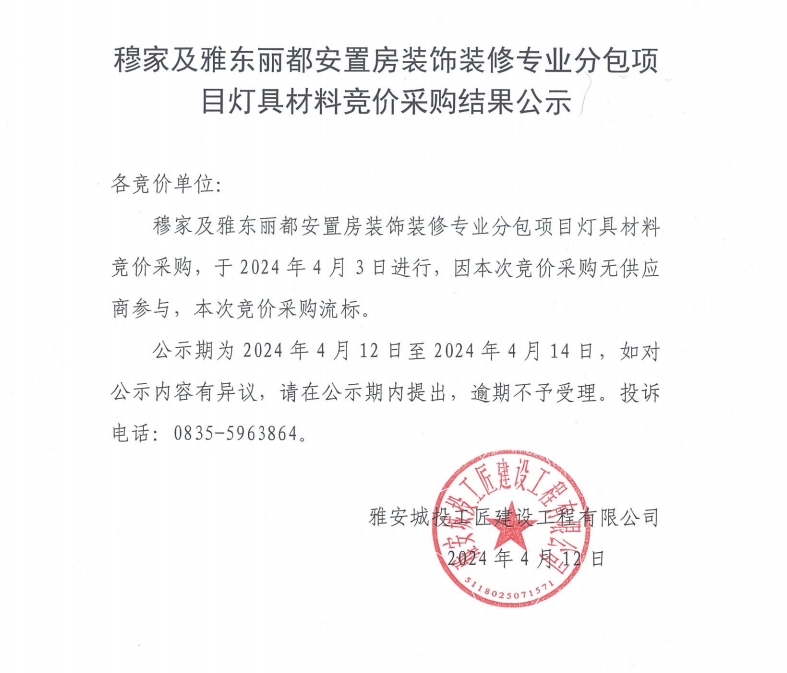 穆家及雅東麗都安置房裝飾裝修專(zhuān)業(yè)分包項(xiàng)目燈具材料競(jìng)價(jià)采購(gòu)結(jié)果公示