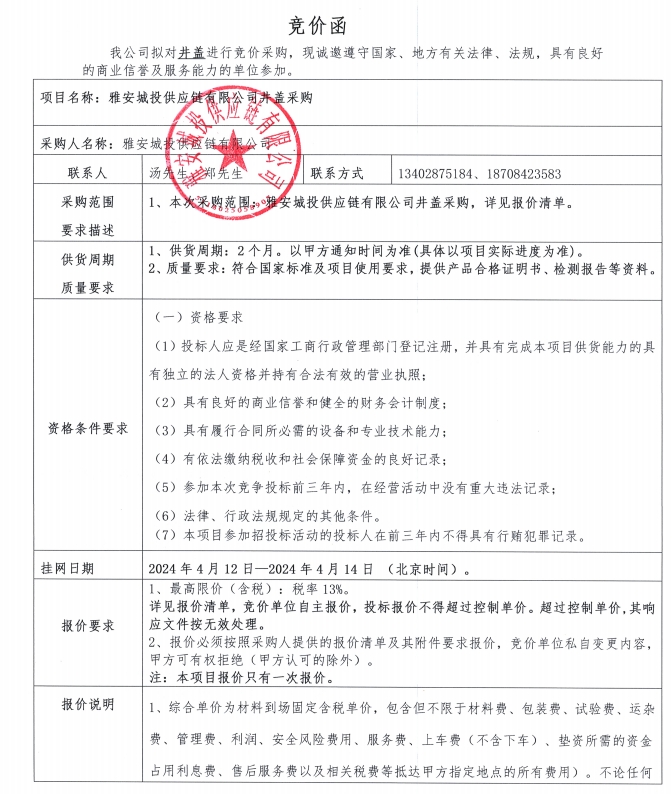 雅安城投供應鏈有限公司井蓋采購競價公告