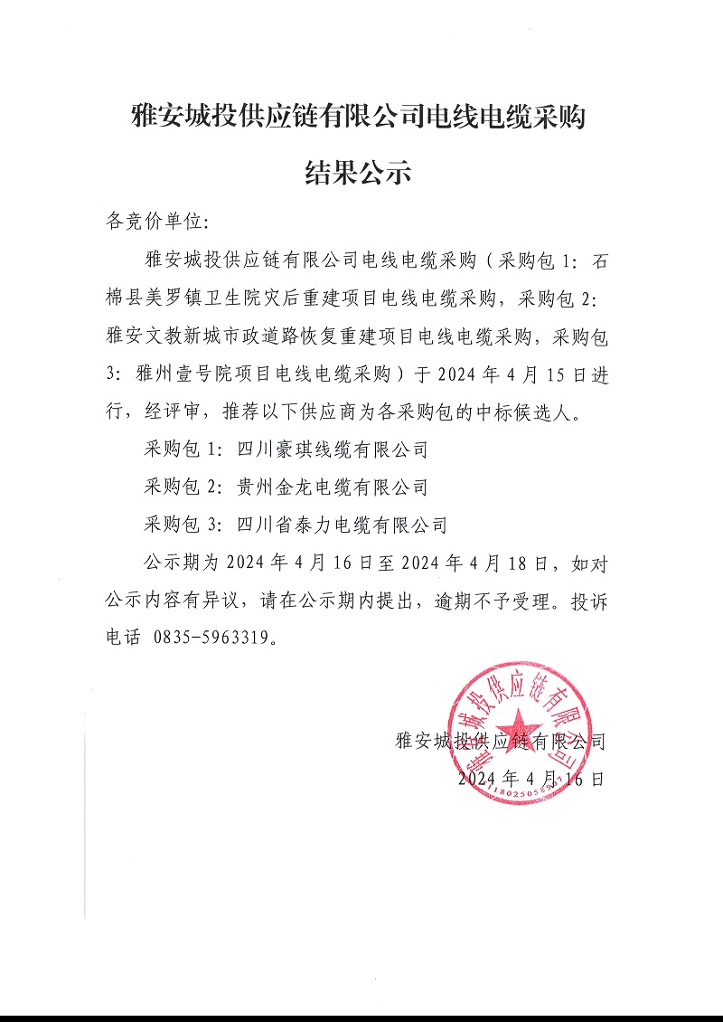 雅安城投供應鏈有限公司電線電纜采購結(jié)果公示