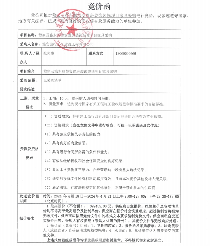穆家及雅東麗都安置房裝飾裝修項(xiàng)目家具采購(gòu)(第二次)競(jìng)價(jià)公告