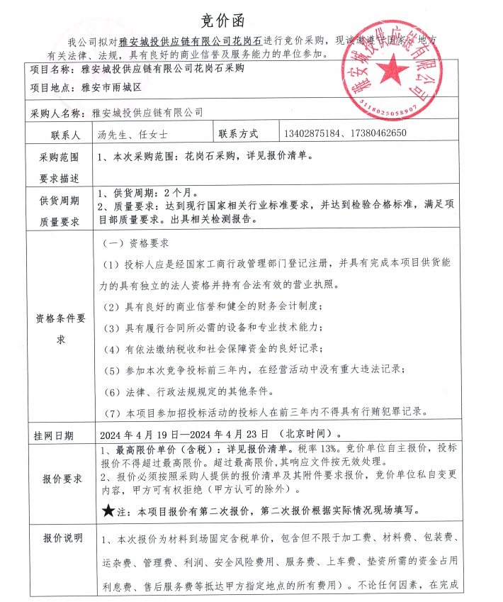 雅安城投供應(yīng)鏈有限公司花崗石采購競價公告