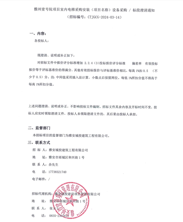 雅州壹號(hào)院項(xiàng)目室內(nèi)電梯采購(gòu)安裝(項(xiàng)目名稱)設(shè)備采購(gòu)/標(biāo)段澄清通知