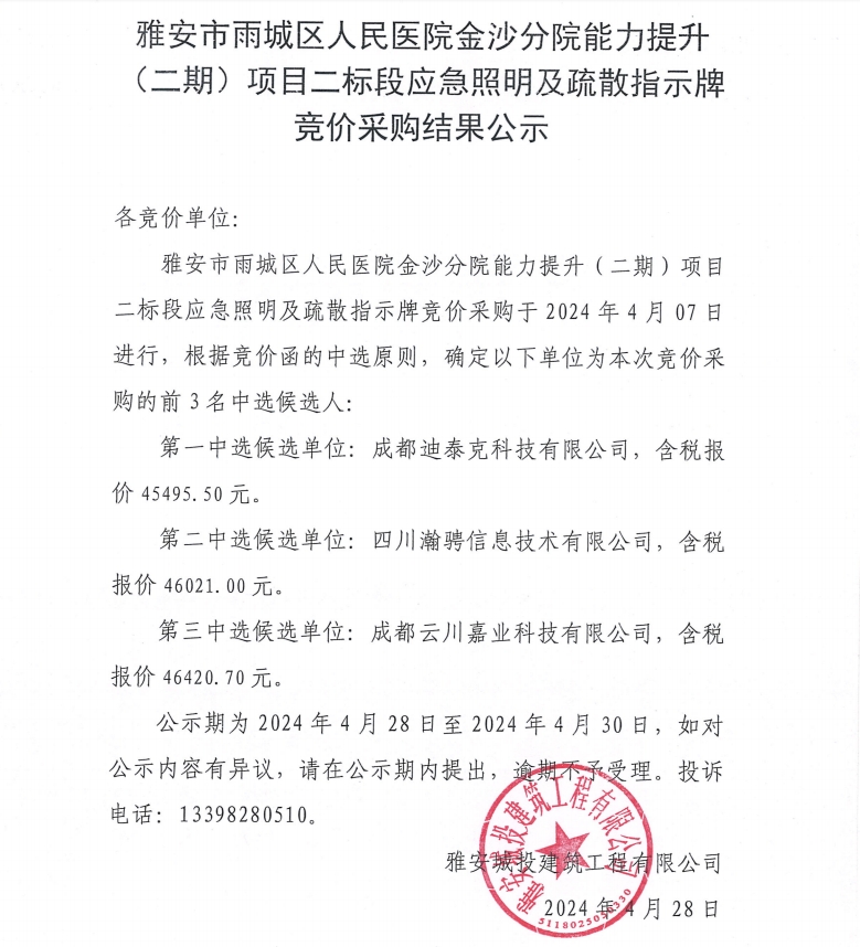 雅安市雨城區(qū)人民醫(yī)院金沙分院能力提升(二期)項(xiàng)目二標(biāo)段應(yīng)急照明及疏散指示牌競價采購結(jié)果公示