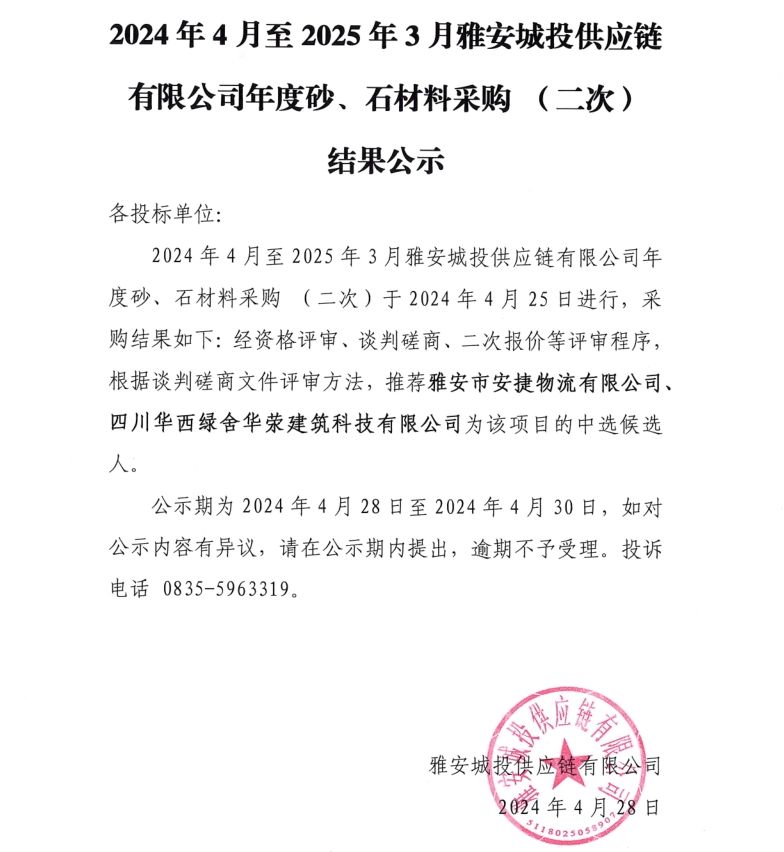 2024年4月至2025年3月雅安城投供應(yīng)鏈有限公司年度砂、石材料采購(二次)結(jié)果公示