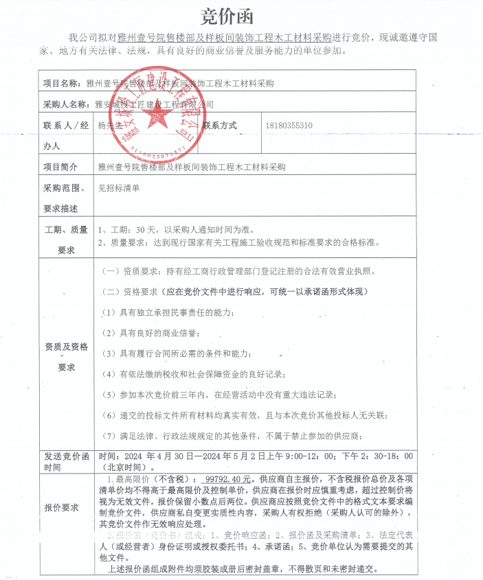 競(jìng)價(jià)函-木工材料采購(gòu)-雅州壹號(hào)院售樓部及樣板間