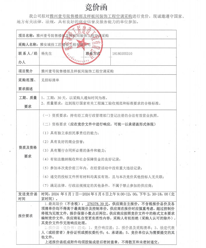 雅州壹號院售樓部及樣板間裝飾工程空調采購競價公告