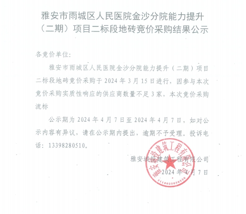 雅安市雨城區(qū)人民醫(yī)院金沙分院能力提升(二期)項目二標(biāo)段地磚競價采購結(jié)果公示