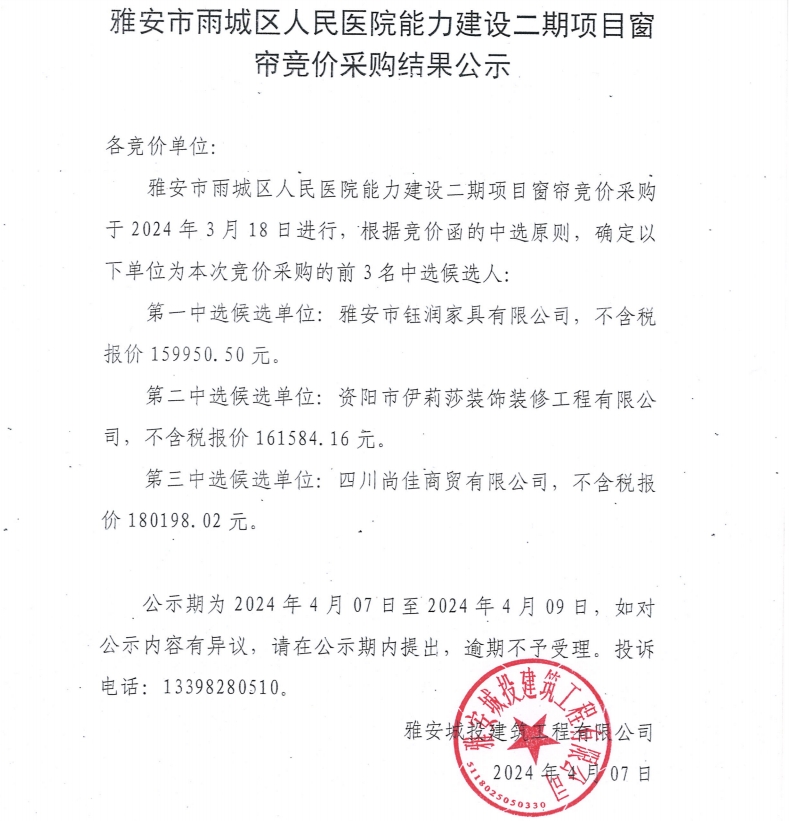 雅安市雨城區(qū)人民醫(yī)院能力建設(shè)二期項(xiàng)目窗簾競價采購結(jié)果公示