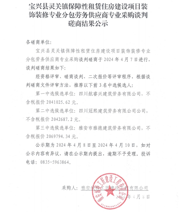 寶興縣靈關(guān)鎮(zhèn)保障性租賃住房建設(shè)項目裝飾裝修專業(yè)分包勞務(wù)供應(yīng)商專業(yè)采購談判磋商結(jié)果公示