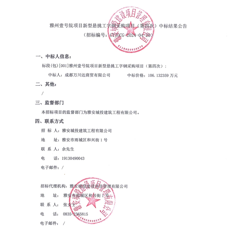 雅州壹號(hào)院項(xiàng)目新型懸挑工字鋼采購項(xiàng)目(第四次)中標(biāo)結(jié)果公告
