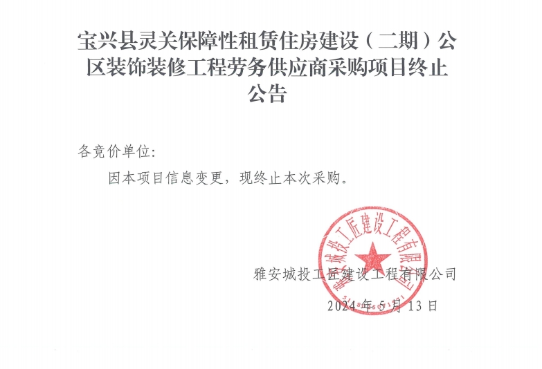 寶興縣靈關(guān)保障性租賃住房建設(shè)(二期)公區(qū)裝飾裝修工程勞務(wù)供應(yīng)商采購(gòu)項(xiàng)目終止公告
