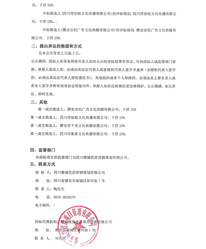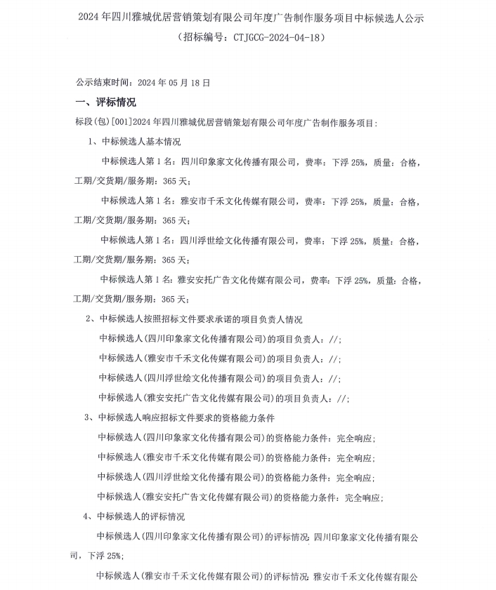 2024年四川雅城優(yōu)居營銷策劃有限公司年度廣告制作服務(wù)項目中標候選人公示