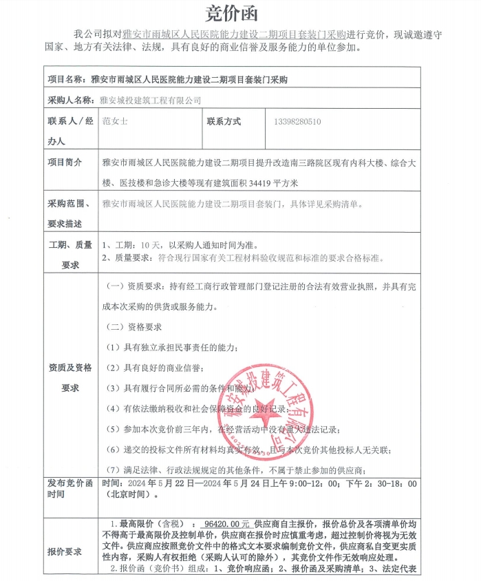 雅安市雨城區(qū)人民醫(yī)院能力建設(shè)二期項(xiàng)目套裝門采購競價公告