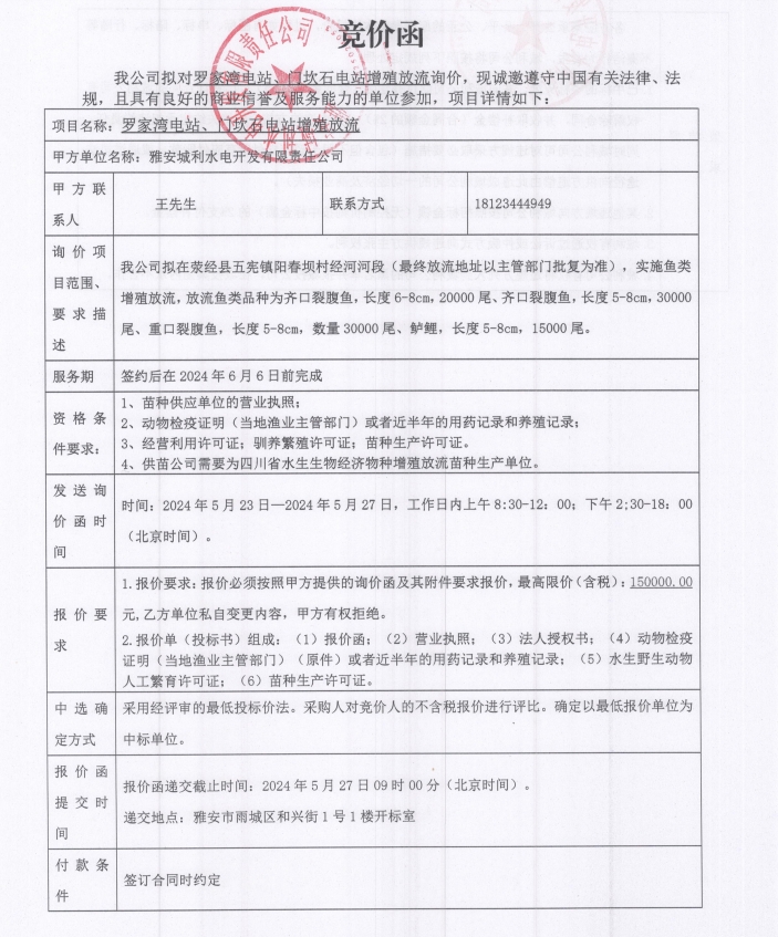 羅家灣電站、門坎石電站增殖放流競(jìng)價(jià)函