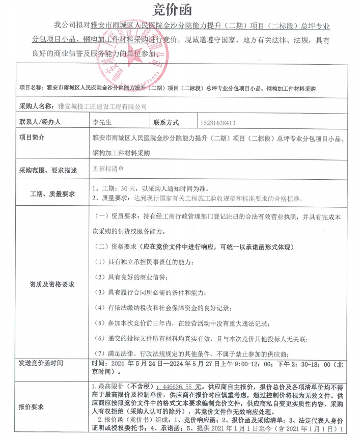 雅安市雨城區(qū)人民醫(yī)院金沙分院能力提升(二期)項目(二標段)總坪專業(yè)分包項目小品、鋼構加工件材料采購競價函