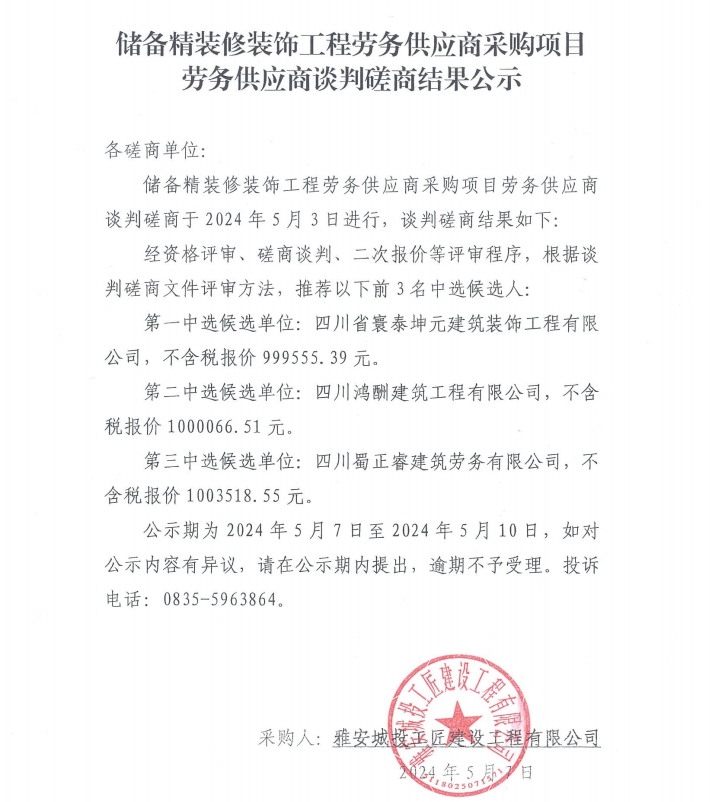 儲備精裝修裝飾工程勞務供應商采購項目勞務供應商談判磋商結果公示