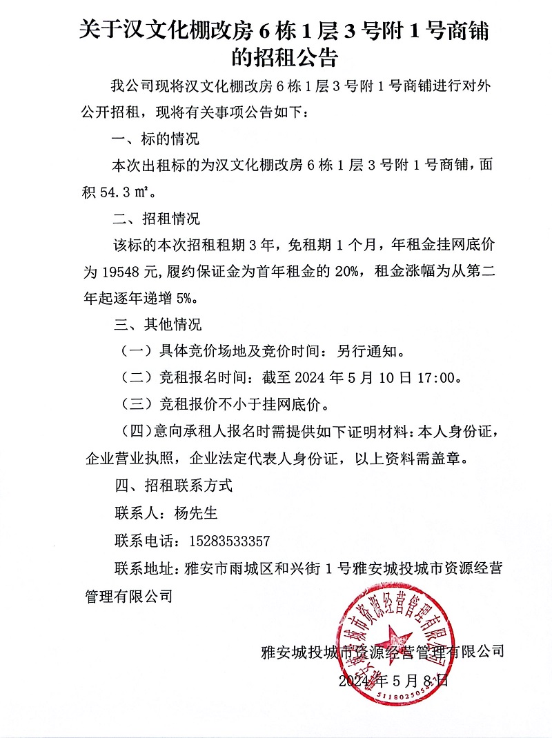 關(guān)于漢文化棚改房6棟1層3號附1號商鋪的招租公告