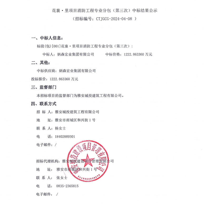 花襄·里項目消防工程專業(yè)分包(第三次)中標結果公示