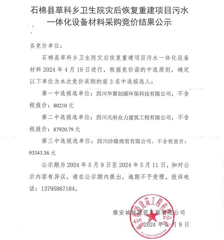 石棉縣草科鄉(xiāng)衛(wèi)生院災(zāi)后恢復(fù)重建項目污水一體化設(shè)備材料采購競價結(jié)果公示