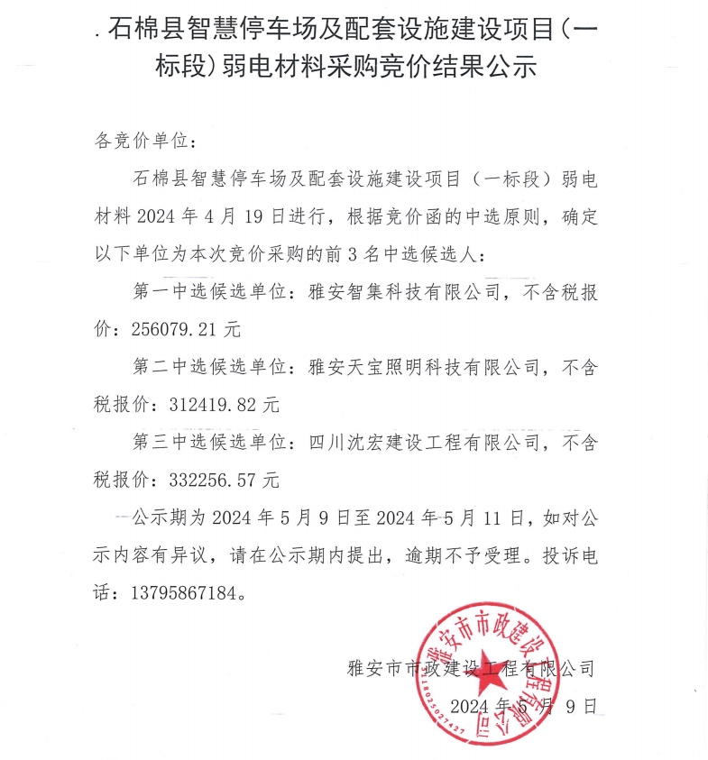 石棉縣智慧停車場及配套設(shè)備建設(shè)項(xiàng)目(一標(biāo)段)弱電材料采購競價(jià)結(jié)果公示