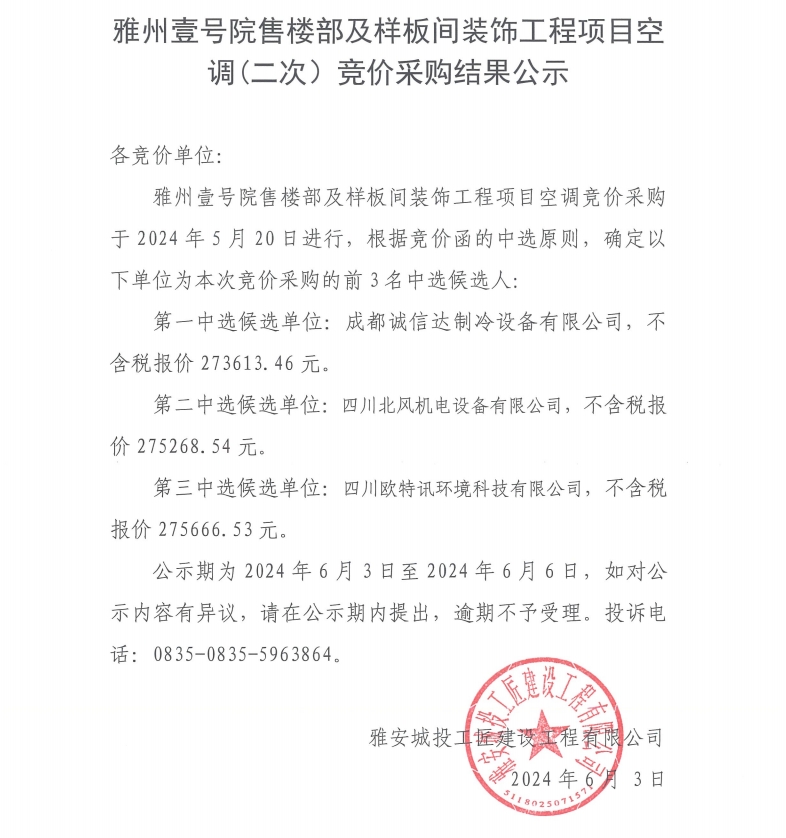 雅州壹號(hào)院售樓部及樣板間裝飾工程項(xiàng)目空調(diào)(二次)競(jìng)價(jià)采購結(jié)果公示