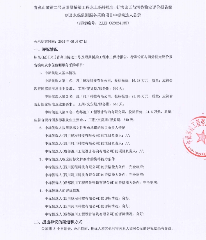 青鼻山隧道二號(hào)及附屬橋梁工程水土保持報(bào)告、行洪論證與河勢(shì)穩(wěn)定評(píng)價(jià)報(bào)告編制及水保監(jiān)測(cè)服務(wù)采購(gòu)項(xiàng)目中標(biāo)候選人公示
