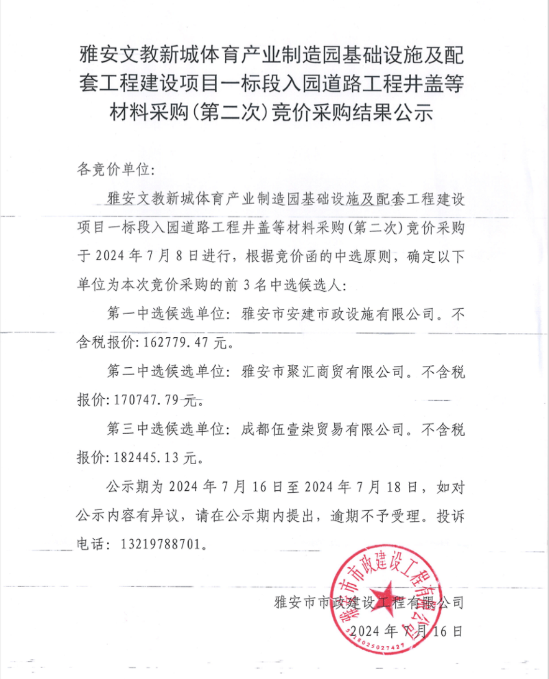 雅安文教新城體育產業(yè)制造園基礎設施及配套工程建設項目一標段入園道路工程井蓋等材料采購(第二次)競價采購結果公示