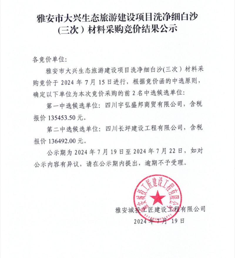 雅安市大興生態(tài)旅游建設項目洗凈細白沙(三次)材料采購競價結果公示