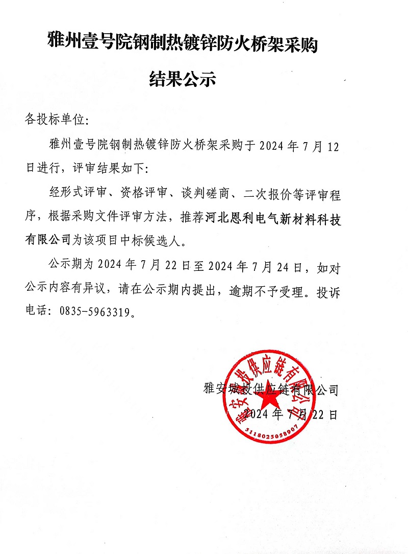 雅州壹號(hào)院鋼制熱鍍鋅防火橋架采購(gòu)結(jié)果公示