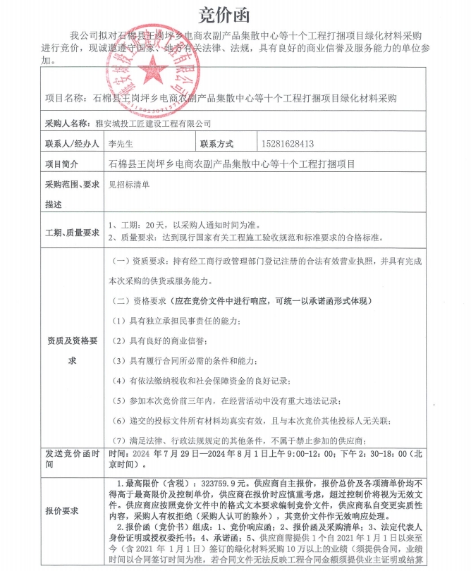 石棉縣王崗坪鄉(xiāng)電商農(nóng)副產(chǎn)品集散中心等十個工程打捆項(xiàng)目綠化材料競價函