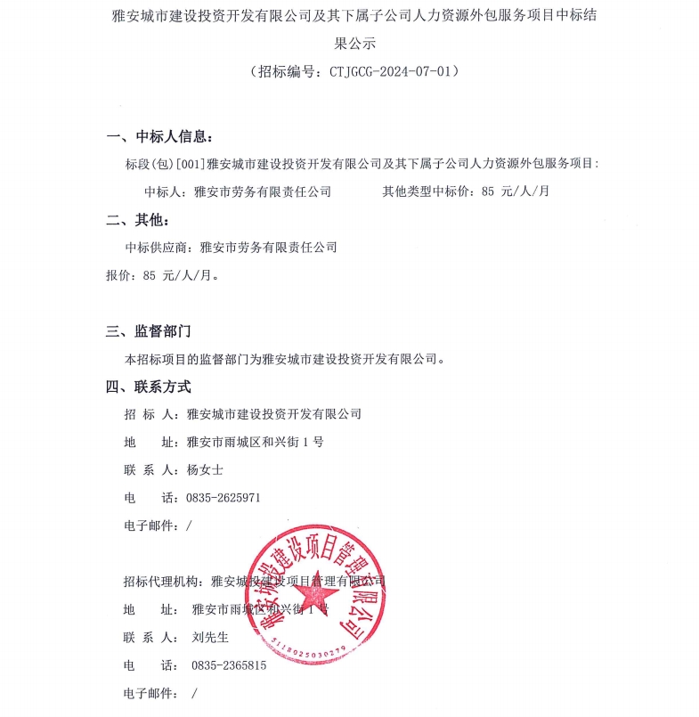 雅安城市建設投資開發(fā)有限公司及其下屬子公司人力資源外包服務項目中標結果公示