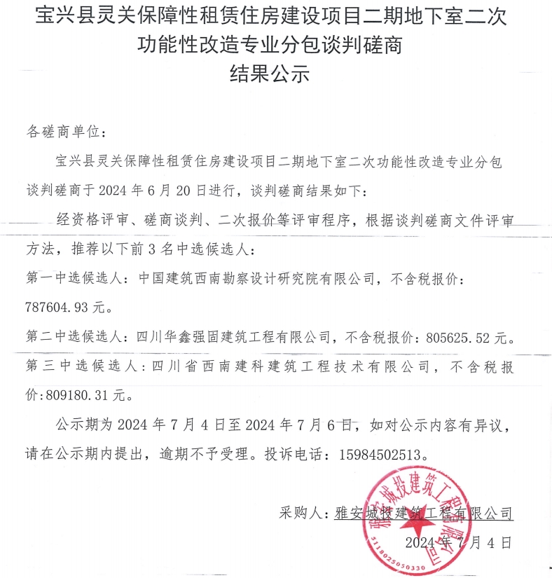 寶興縣靈關(guān)保障性租賃住房建設(shè)項目二期地下室二次項目性改造專業(yè)分包談判磋商結(jié)果公示