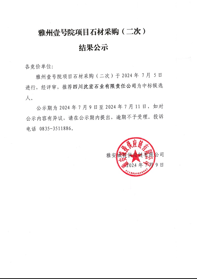 雅州壹號院項目石材采購(二次)結果公示