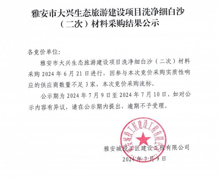 雅安市大興生態(tài)旅游建設項目洗凈細白沙(二次)材料采購結果公示