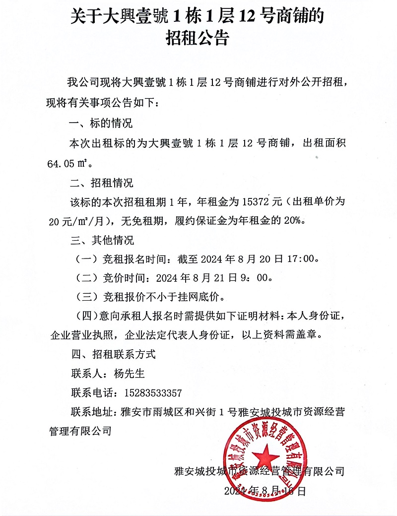 關(guān)于大興壹號1棟1層12號商鋪的招租公告