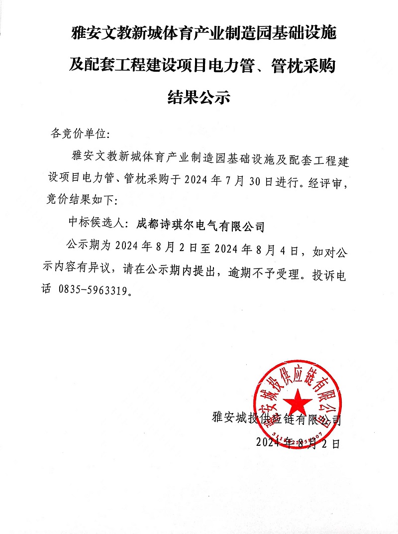 雅安文教新城體育產(chǎn)業(yè)制造園基礎設施及配套工程建設項目電力管、管枕采購結果公示