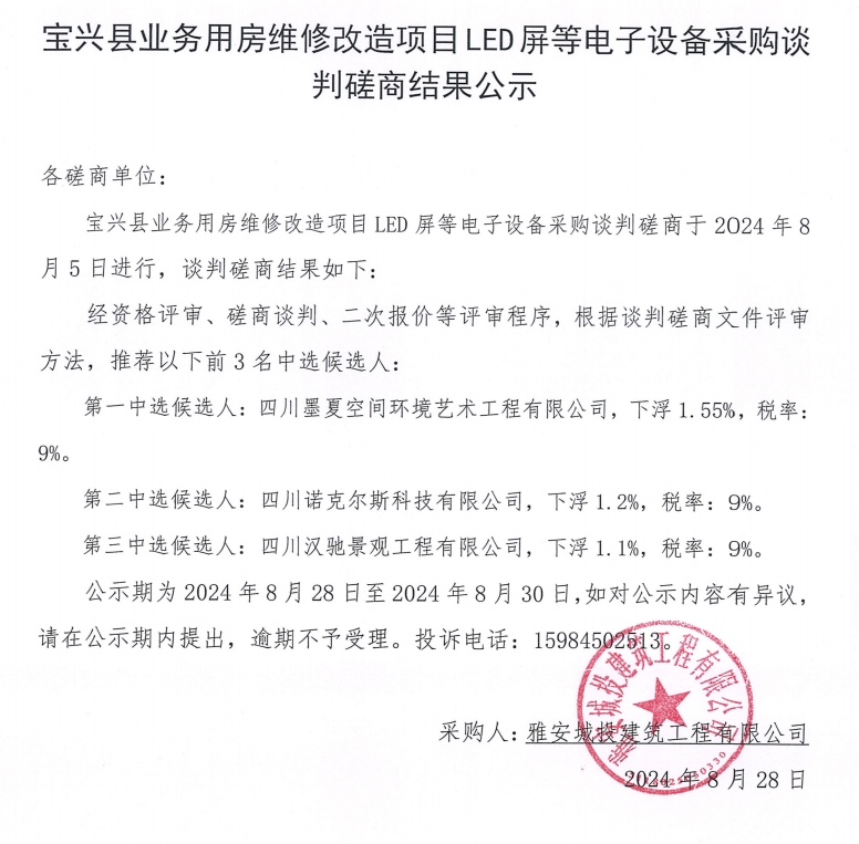 寶興縣業(yè)務用房維修改造項目LED屏等電子設(shè)備采購磋商結(jié)果公示