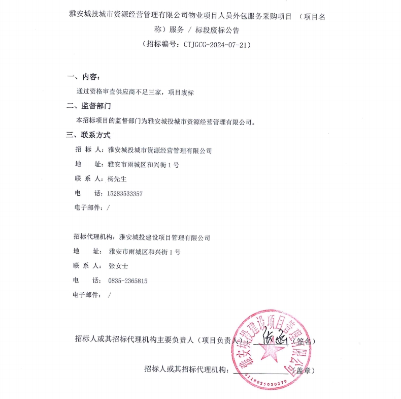 雅安城投城市資源經(jīng)營管理有限公司物業(yè)項目人員外包服務(wù)采購項目(項目名稱)服務(wù)/標(biāo)段廢標(biāo)公告