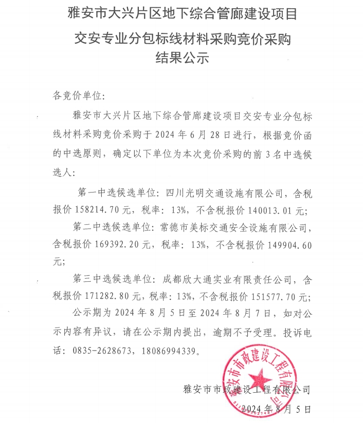 雅安市大興片區(qū)地下綜合管廊建設(shè)項(xiàng)目道路專業(yè)分包標(biāo)線材料采購競(jìng)價(jià)采購結(jié)果公示