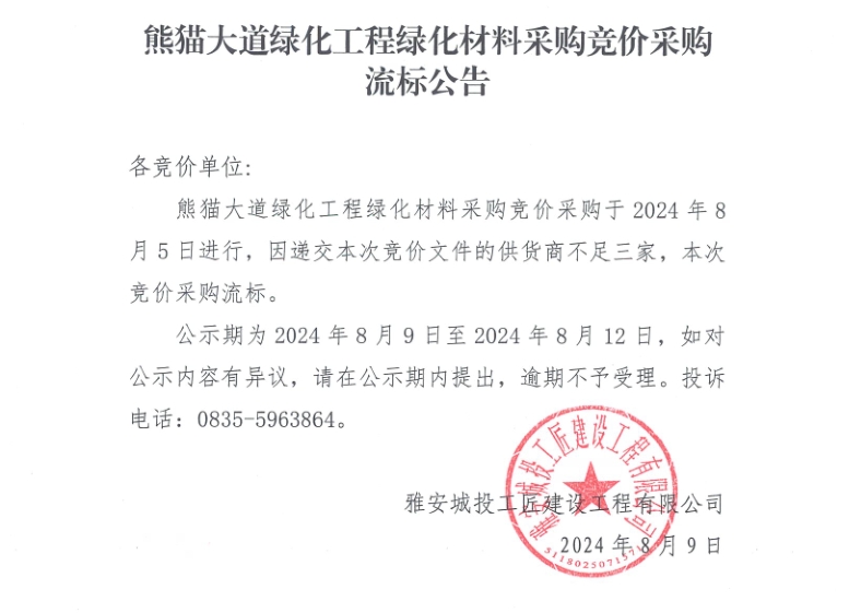 熊貓大道綠化工程綠化材料采購(gòu)競(jìng)價(jià)采購(gòu)流標(biāo)公告
