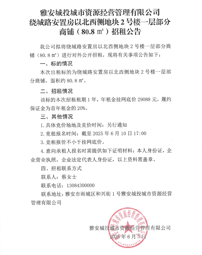 雅安城投城市資源經(jīng)營管理有限公司繞城路安置房以北西側地塊2號樓一層部分商鋪(80.8m²)招租公告