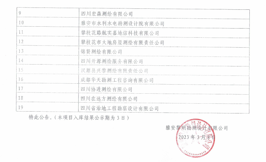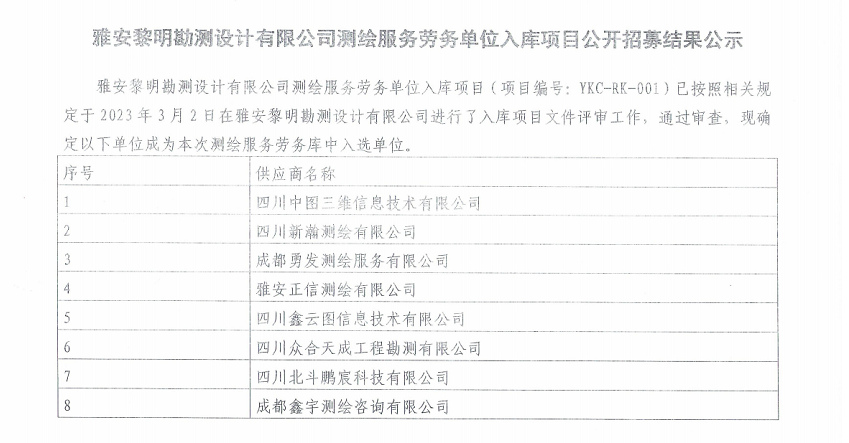 雅安黎明勘測設計有限公司測繪服務勞務單位入庫項目公開招募結果公示
