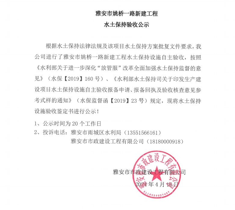 雅安市姚橋一路新建工程水土保持驗(yàn)收公示