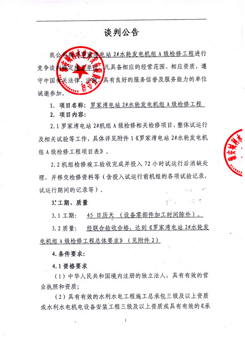羅家灣電站2#水輪發(fā)電機組A級檢修工程談判公告