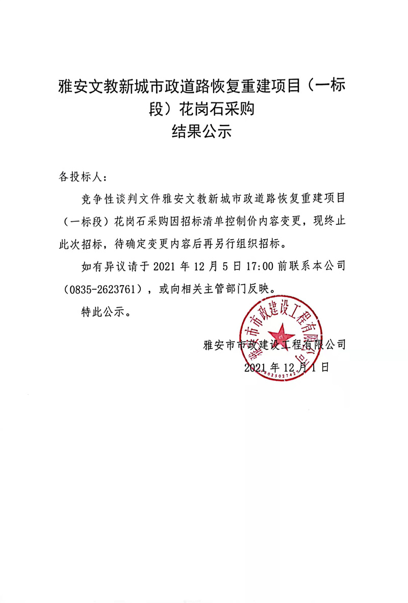 雅安文教新城市政道路恢復重建項目(一標段)花崗石采購結果公示