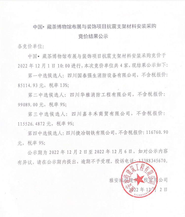 中國(guó)·藏茶博物館布展與裝飾項(xiàng)目抗震支架材料安裝采購(gòu)競(jìng)價(jià)結(jié)果公示