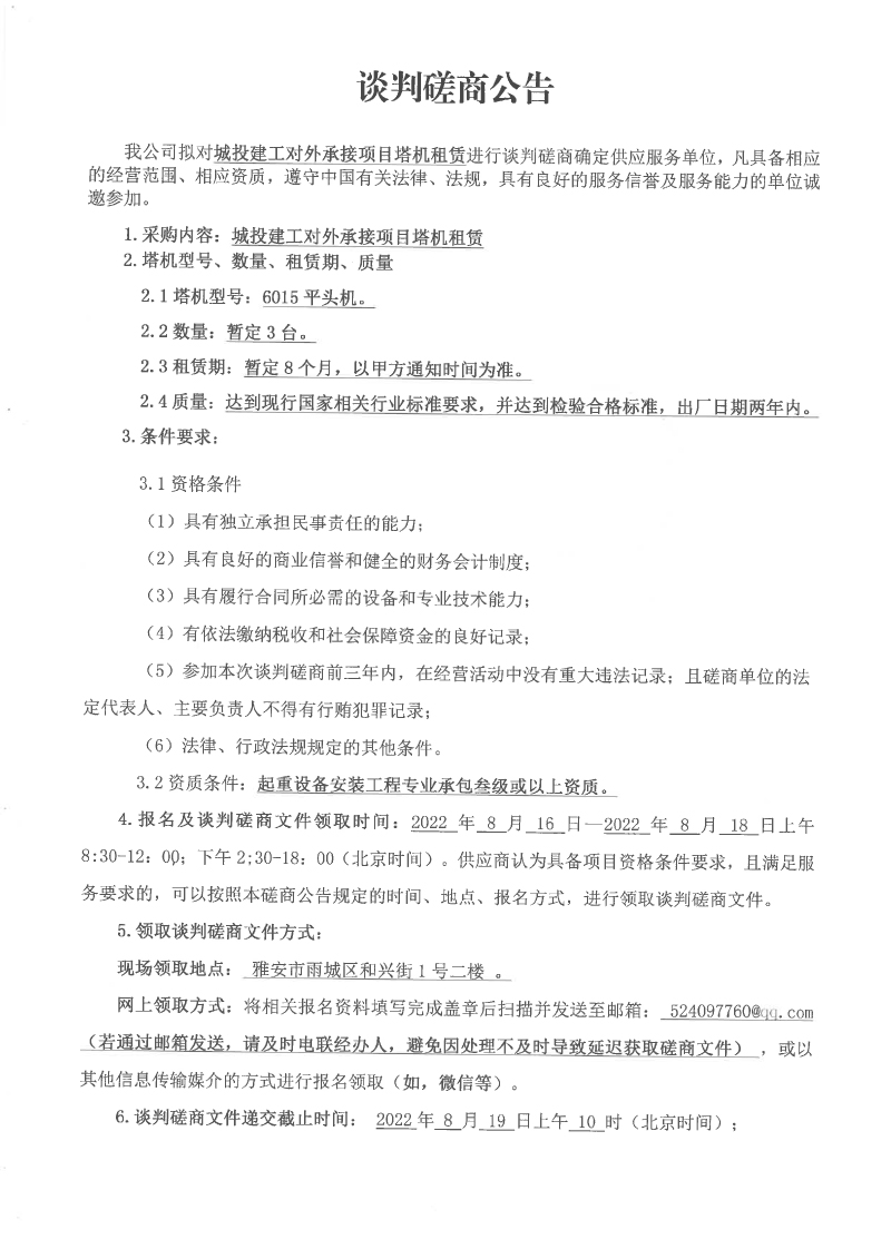 城投建工對(duì)外承接項(xiàng)目塔機(jī)租賃談判磋商公告