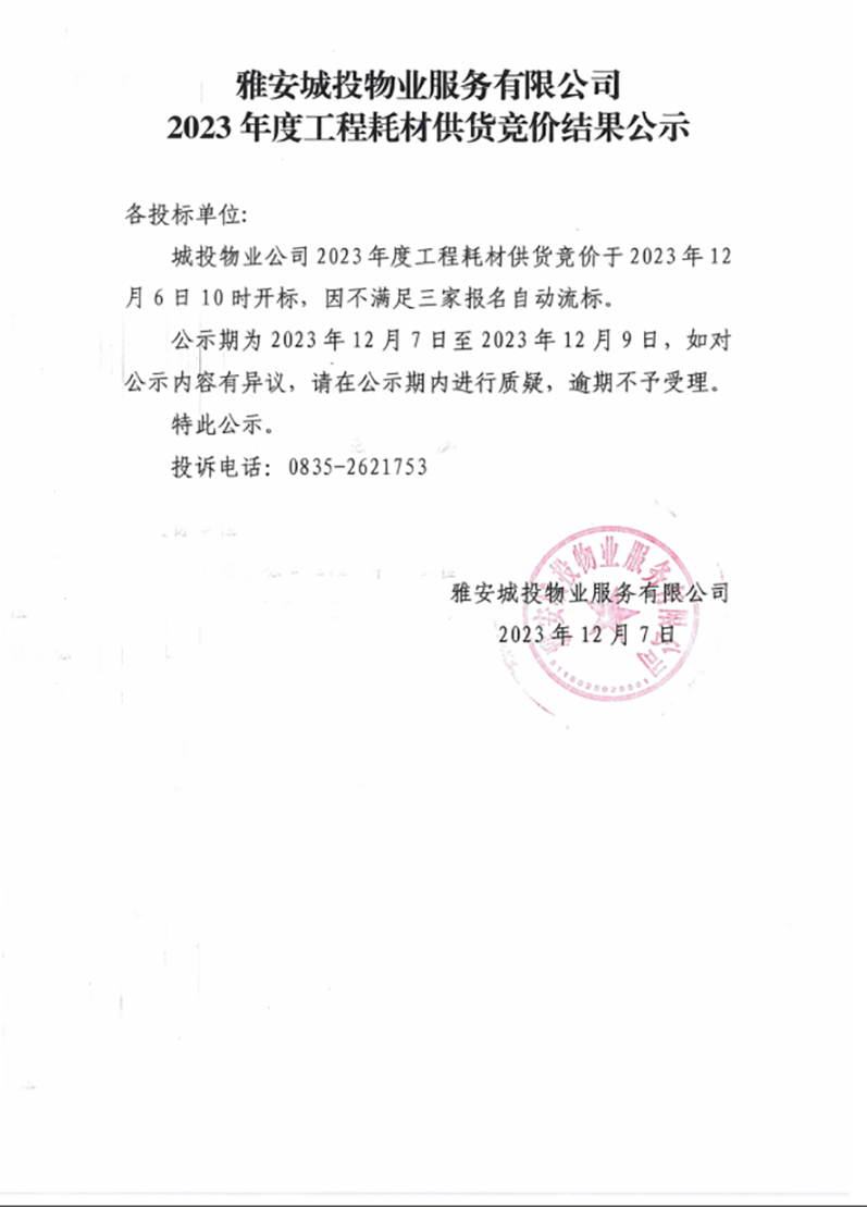 雅安城投物業(yè)服務(wù)有限公司2023年度工程耗材供貨競價結(jié)果公示